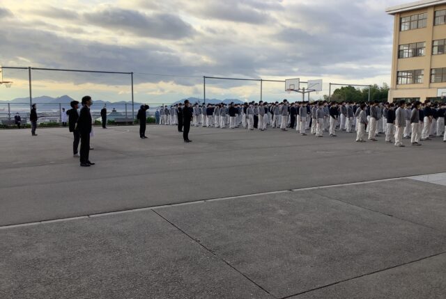今朝の朝礼のときの前庭の様子です。 前庭の東側が大分空いて、アンバランスですね…。高校3年生が朝礼からいなくなり、一番東側が空いた状態です。 集…