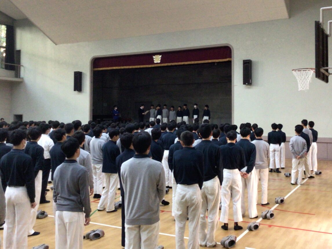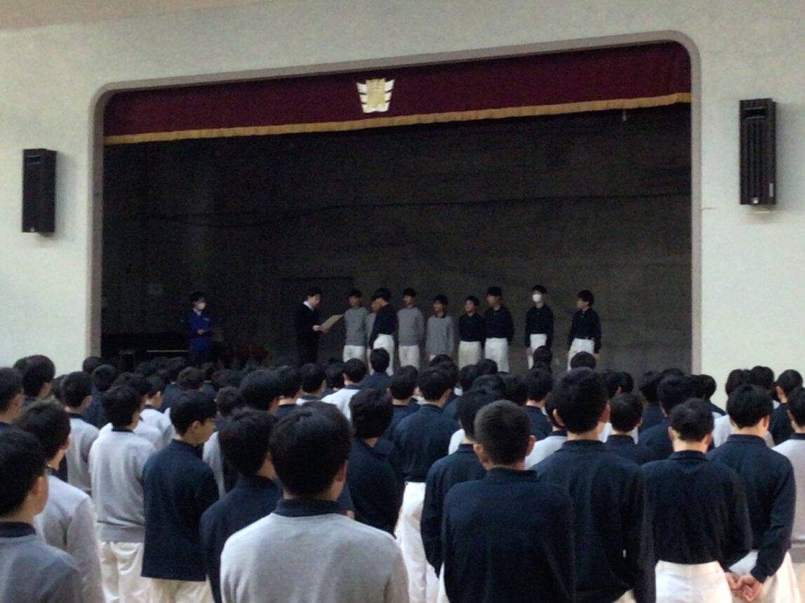 こんにちは! 中学テニス部です。今朝の中学朝礼で、先日の新人大会の表彰をしていただきました。