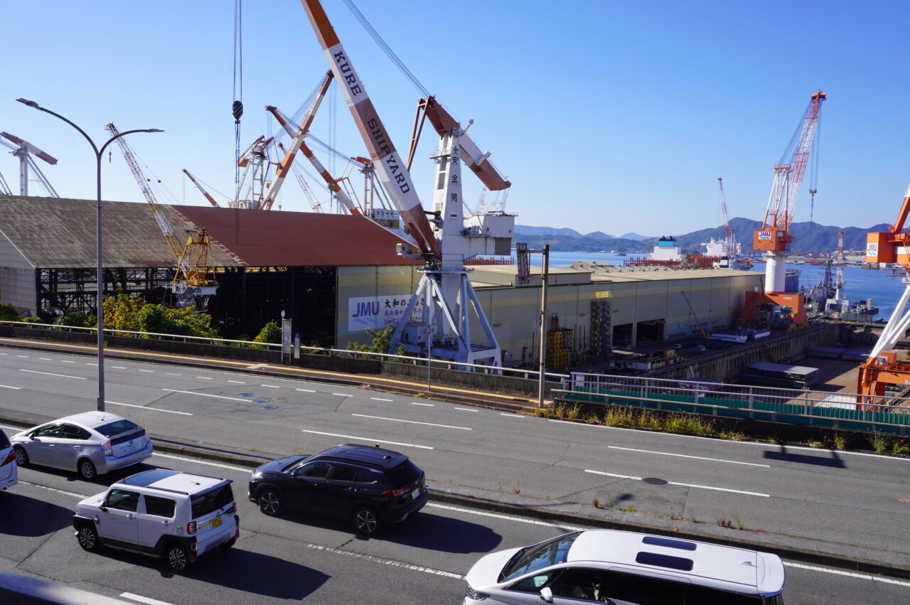 第1術科学校を11時半頃出発し、早歩きで小用港を目指し、11時55分発の呉港行のフェリーに乗って呉市に着きました。その後昼食をとり、歩いて「歴史の見える丘」という旧海軍関連施設や、戦艦「大和」を建造したドック跡が見える場所に行きました。