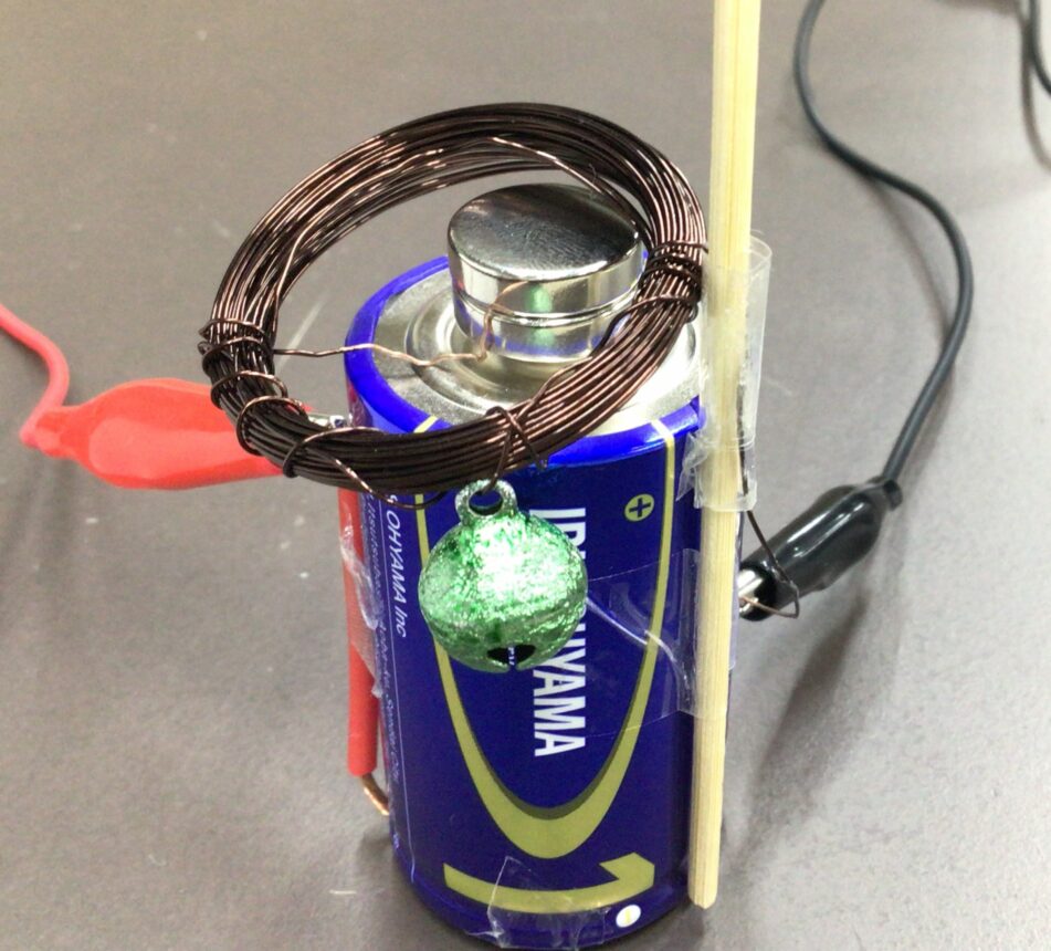 コイルがブルブル振動し,コイルにくっつけた鈴が鳴って
