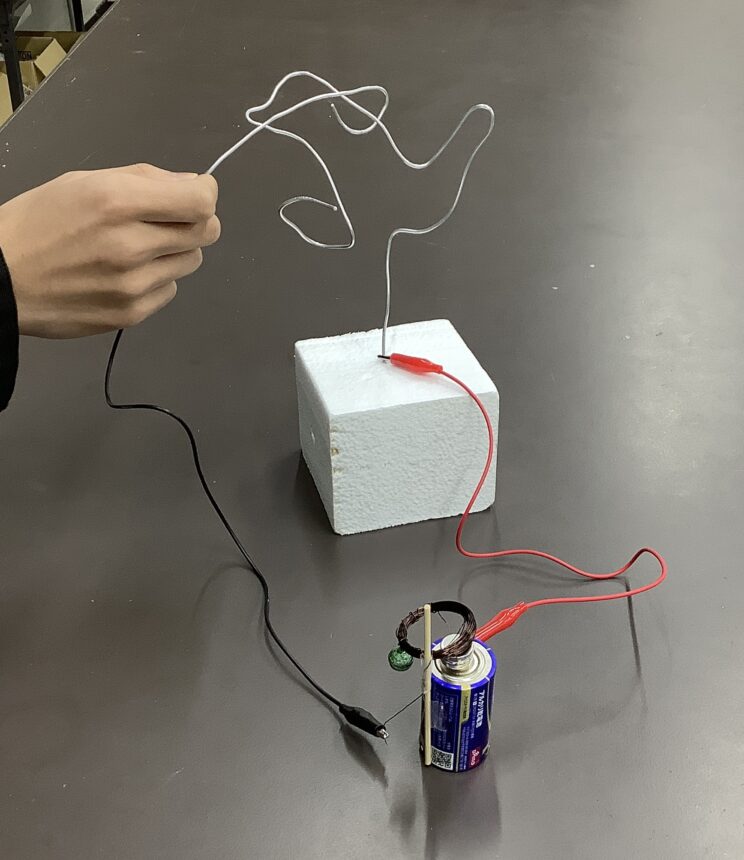 昔のイライラ棒では,途中でコースに触れてしまうと,電流が流れて火花が散ったり,ブザーが鳴ったりしてゲームオーバーになっていました。