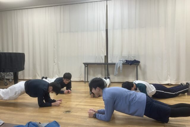 冬の寒い日でも元気に活動してます!ですがあいにく天気は雨。 室内での活動となりました。 筋トレです。ステージの上でやっている生徒もいました。 普段勉強…