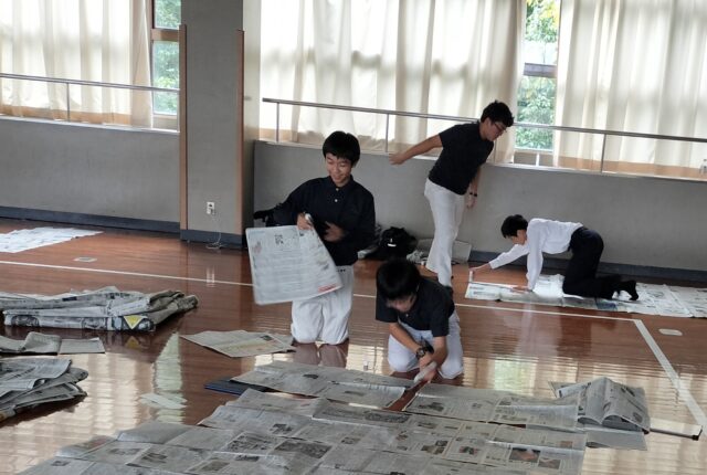 こんばんは! 中学テニス部です。今年も文化祭に向けて大迷路作りに挑戦しました。 こちらが10/31放課後の小体育館です。 「まだまだ新聞を貼らないと間…