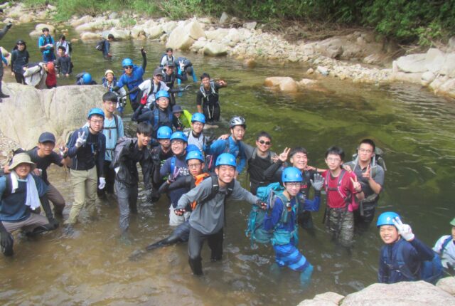 中3高1高2とともに、沢登りに出かけました! 市内は35度をこえる気温ですが…、川は冷たい! 廿日市市飯山の赤ナメラ谷で遊びますみんなでパチリ! さあ…