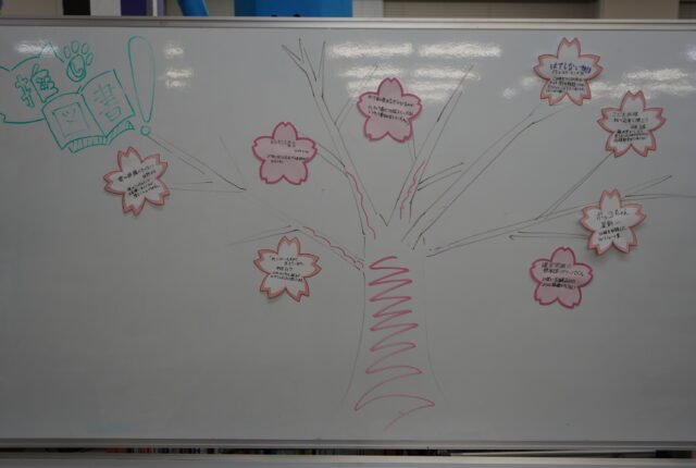 図書館に行くと、ホワイトボードに「桜の木」のような絵が描かれていました。 拡大してみると、左上に「推し図書」と題して、桜の木の花びらとして貼っ…