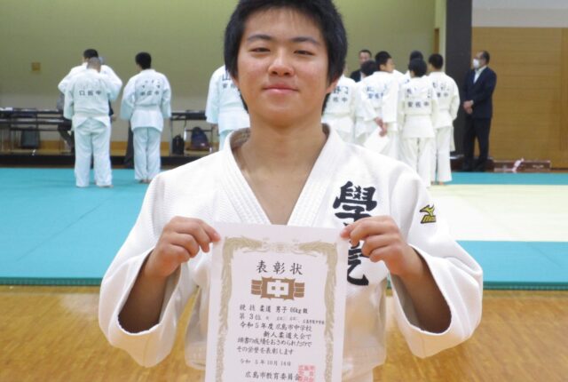 10月14日(土)に県立総合体育館武道場で、広島市中学校新人大会が行われました。中学2年生(67期)のU君が66kg級に出場しました。 激闘の末、3位…