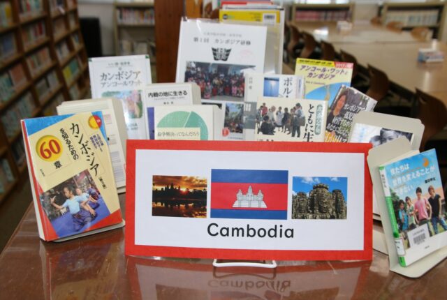 図書館では、司書の方が学校の授業や時事問題に合わせて特設のコーナーを設けてくれます。 今は、本校で昨年から始まったカンボジア研修関係のコーナーや…