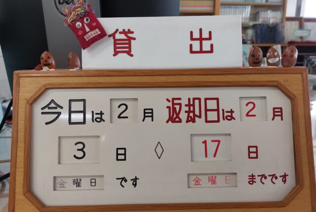 今日は2月3日で節分の日でした。そこで今日の図書委員たちにもその雰囲気を出してもらいました。まずは昼の業務の様子です。 放課後も閉館後に金曜日の図…