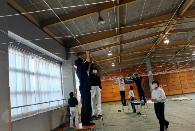 体育館の天井にロープが張り巡らされました。いよいよです。