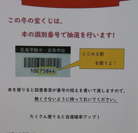 図書委員会では、12月19日~22日の期間中に「宝くじ」企画を行いました。企画の内容は以下の通りで、利用者が借りた本に付されている番号を図書委員が控…