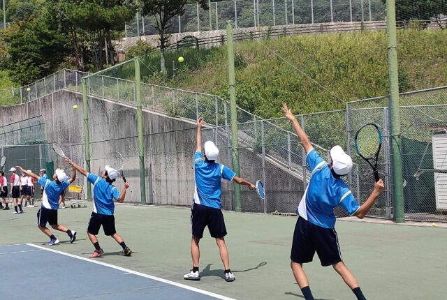 中3の練習はサーブ練習から始まります。それぞれ誰か、後ろ姿でわかった人は学院中テニス部マニアですね。 中3の練習はコートが熱くなってくる10時半~12…