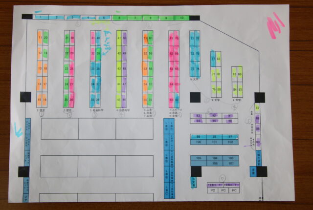 蔵書点検2日目です。 本日は、昨日の続きからです。 蔵書点検か終わった棚に色を塗っていますが、まだまだ終わりません。 昨日に引き続き、数人一組で作業を…