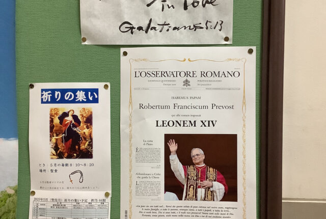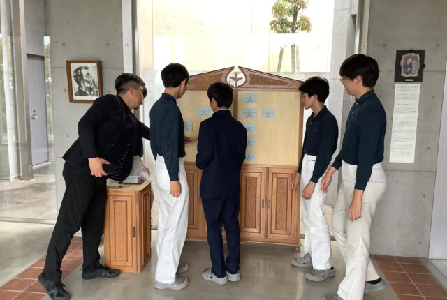 アシジの聖フランシスコ聖堂の入り口付近には、昔からロサドさん作の大きな木の棚が置かれています。この棚は、この度、ロサドさんと校務さんのご協力を得て「祈…