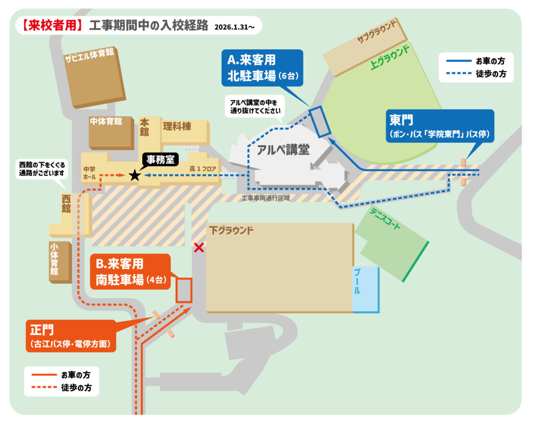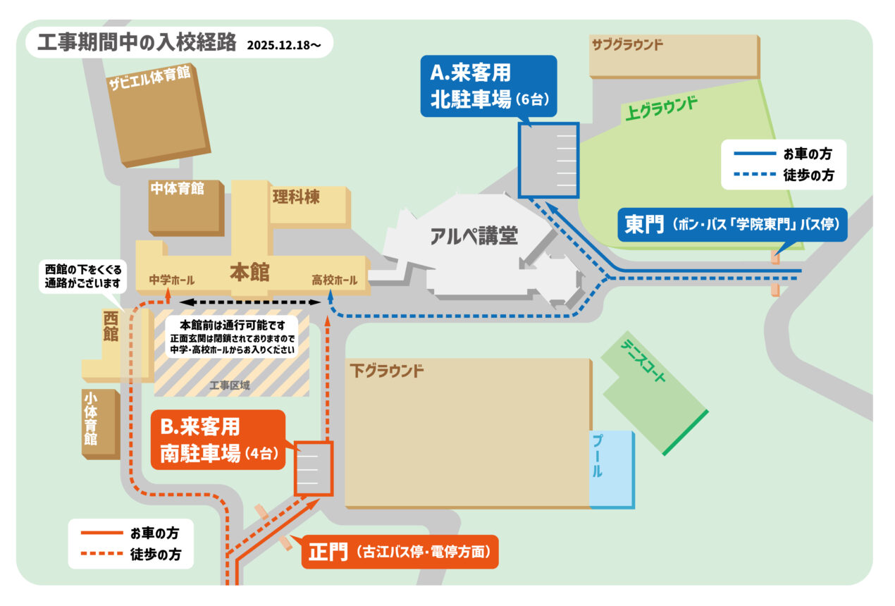工事区域の拡大に伴い、前庭の使用、校内道路(アルペ講堂前~下グラウンド入口付近)の通行ができなくなります。