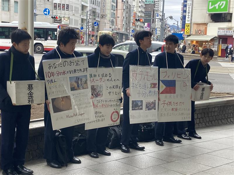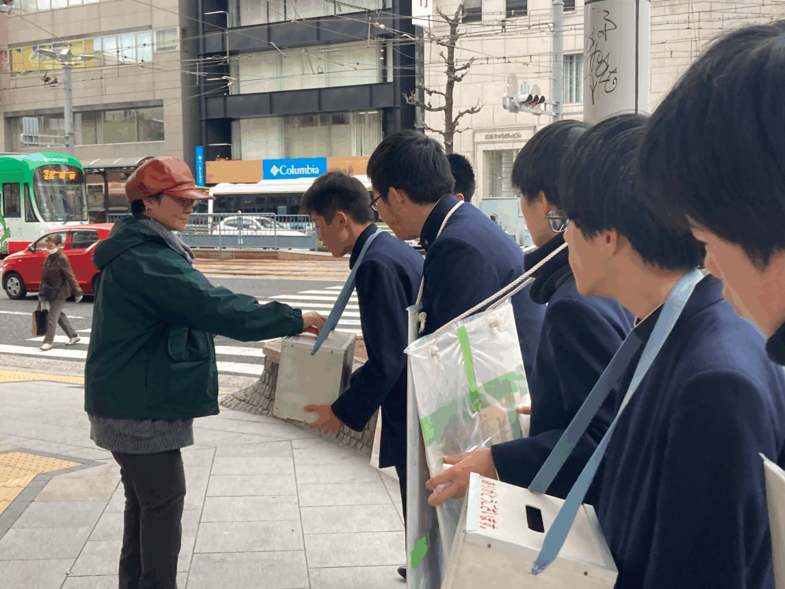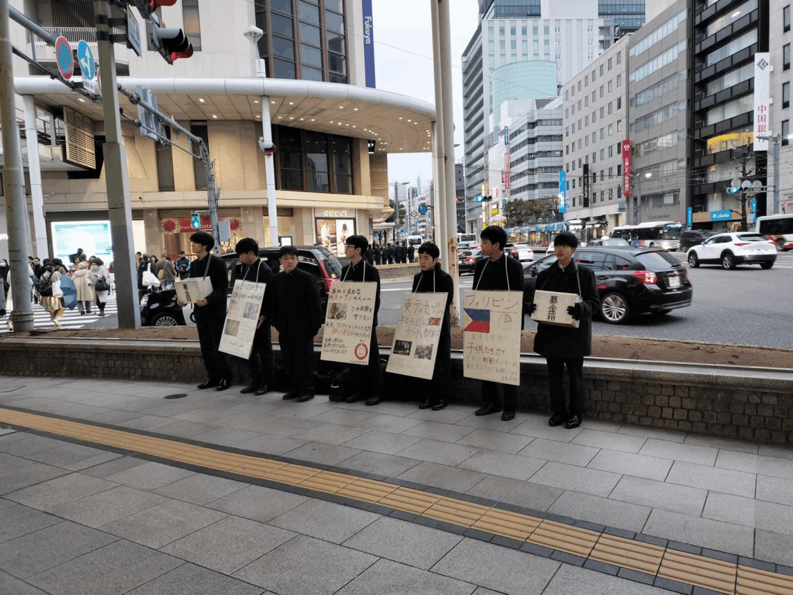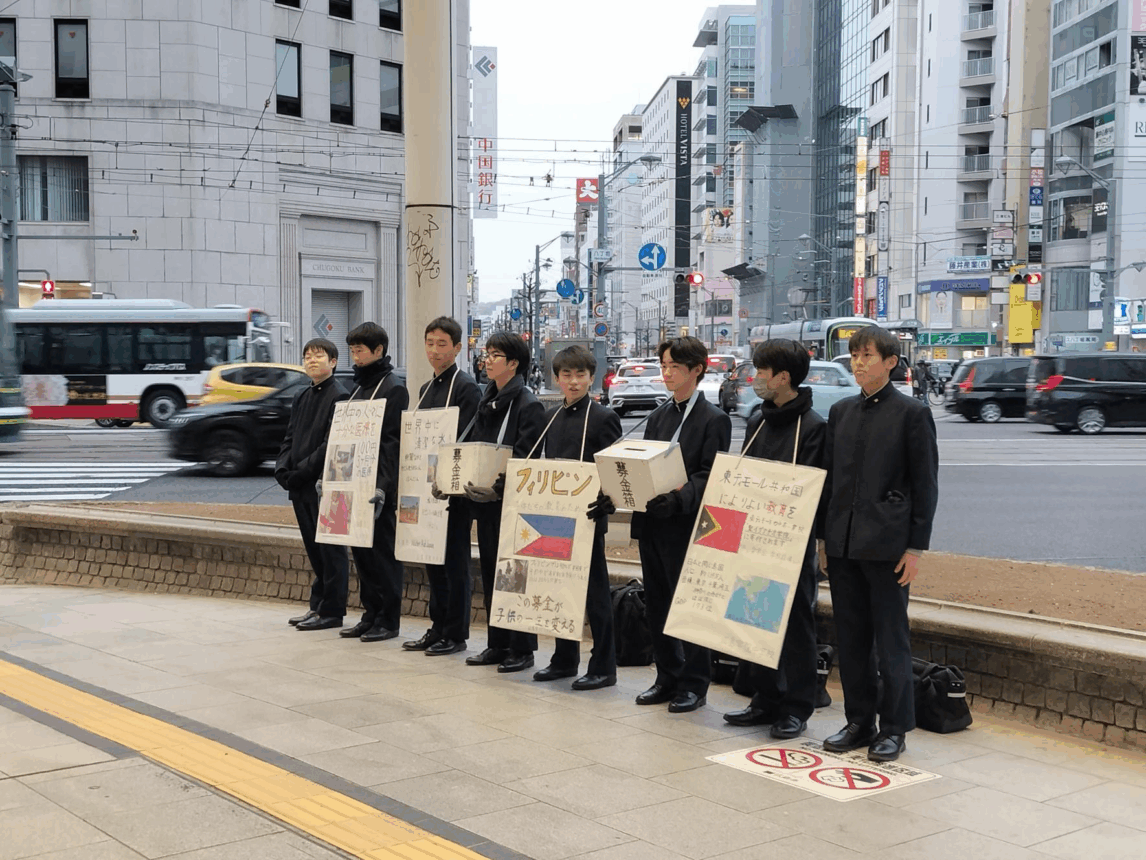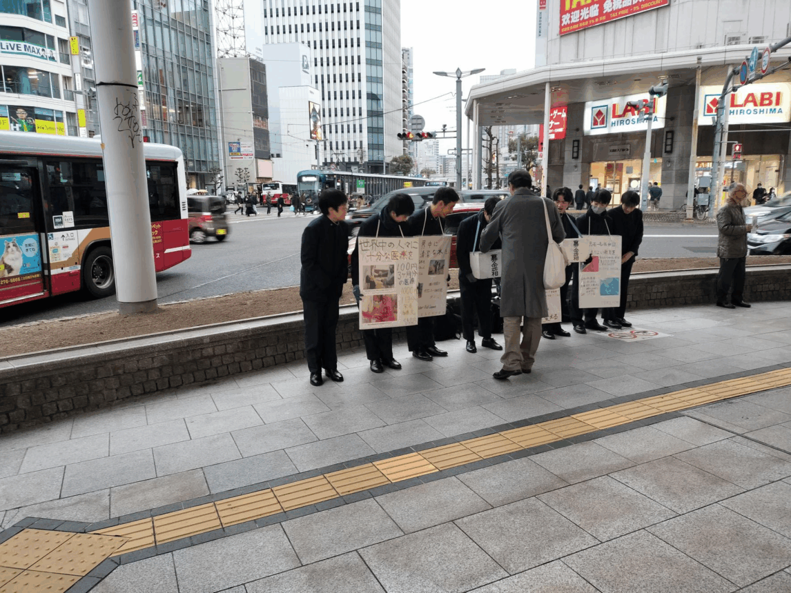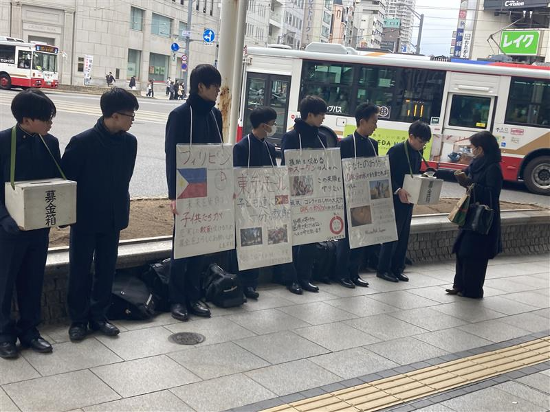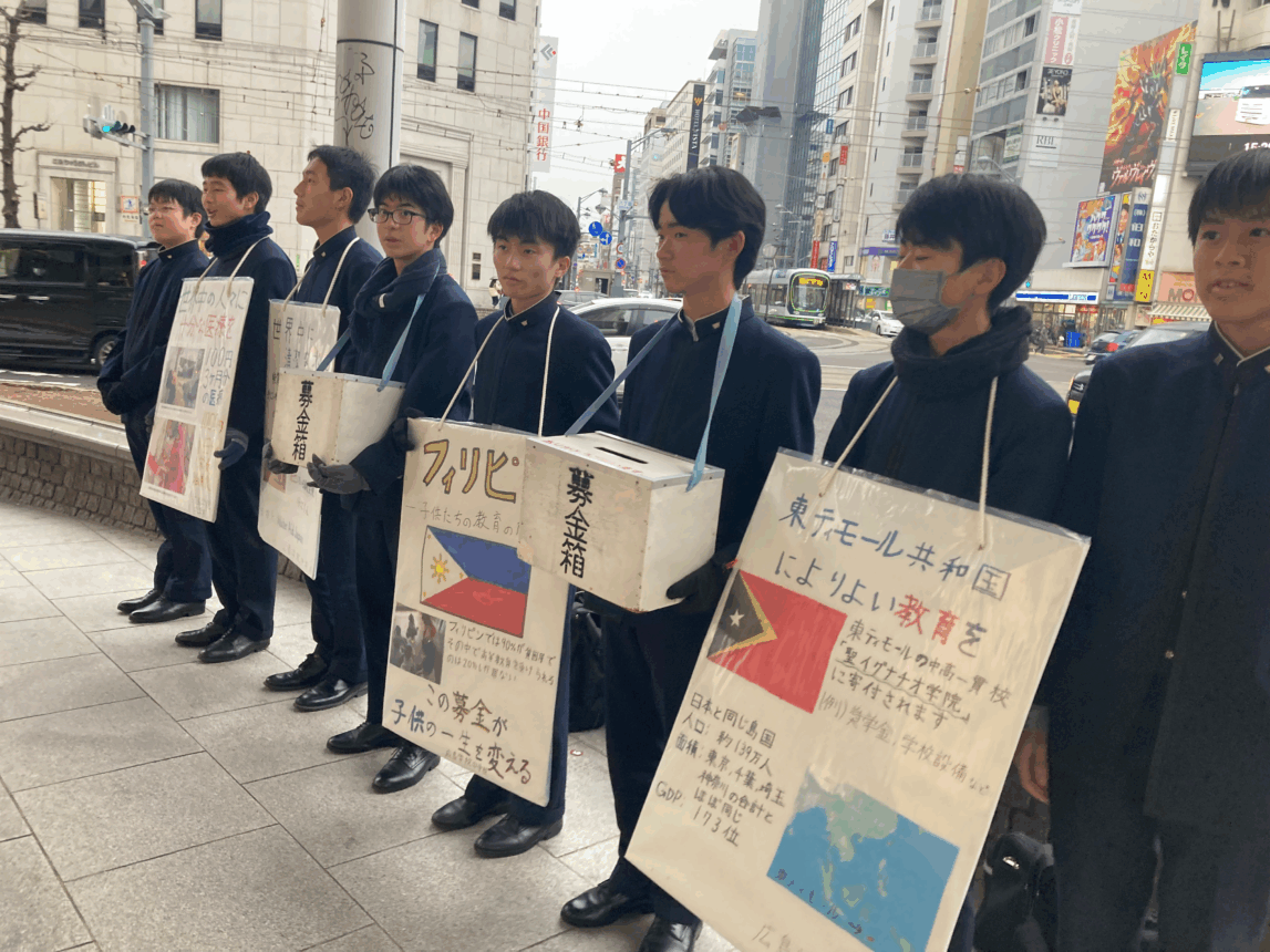 68K(中3) spent two cold days at various locations in downtown Hiroshima collecting donations for educational resources and disaster relief in the Philippines and East Timor. Taking turns in shifts, groups stood on street corners and in front of malls holding poster-boards, collection boxes and calling out to passers-by. We will not announce the amount collected over the two days, but we are very pleased with the amount because we believe it will be a significant contributions to children and families overseas. We would like to express our sincere gratitude to all who contributed no matter how small or large the amount. Merry Christmas!