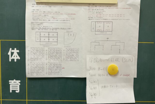 1月末から始まった学院カップも,予選リーグが全て終了しました。 本日の昼休みは見事決勝トーナメントに勝ち上がったクラスの組み合わせ抽選会です. 高2は…