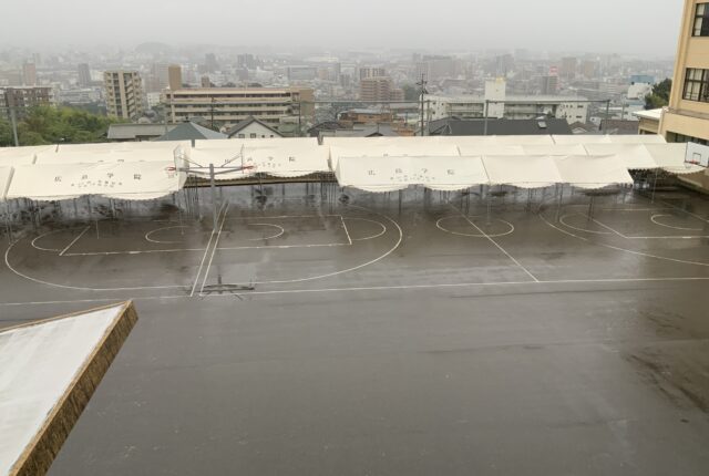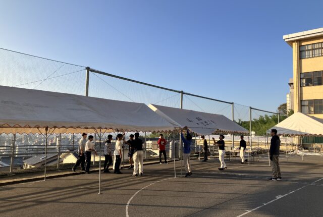 7:00 朝から大忙し! 大雨の影響で、大急ぎの準備となります。 グラウンドは、ジェットコースター制作中! こちらはピタゴラスイッチ! 書道部も展示…