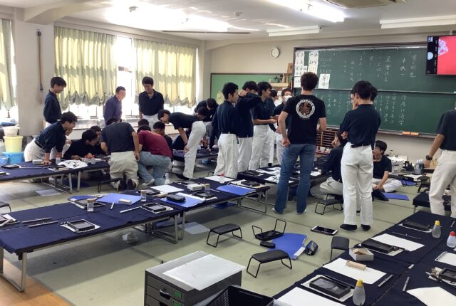 書道教室から少し賑やかな声が。。。気になって覗いてみると べラミン高校の生徒達が、自分の名前を漢字で書く体験をしていました。 学院生が一生懸命漢字を教…