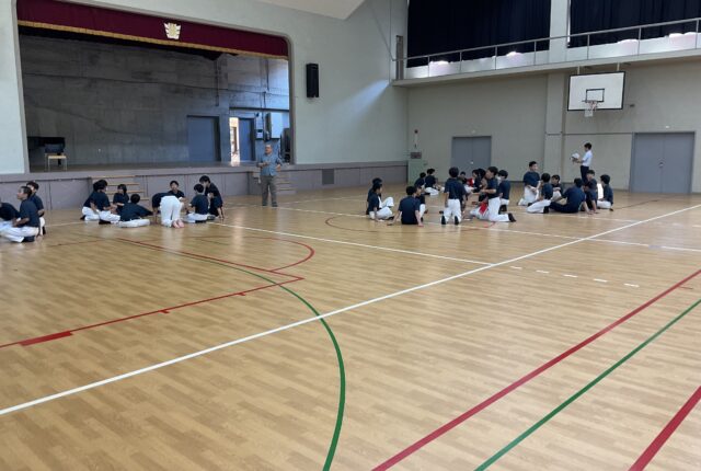 授業時間中に中体育館に行ってみると,何やら不思議なことをしていました。 どうやら中1ILのようですが 1列に並んで前ならえをしたり 今度はかかととかか…