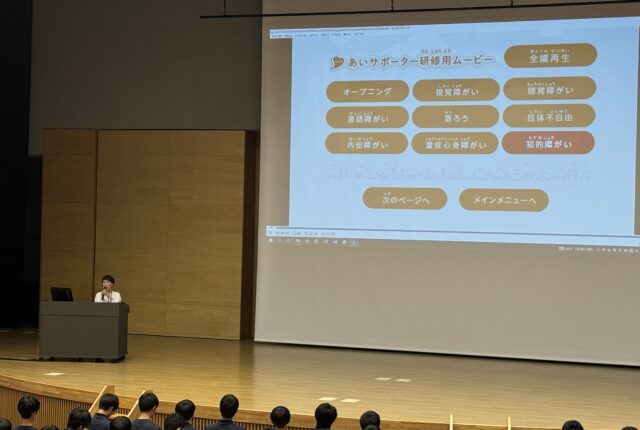 中学2年生のILをのぞいてみました。今日はアルペ講堂で講演が行われていました。 障害者職業生活相談員の方をお招きして、障がいの種類とそれぞれへの手助け…