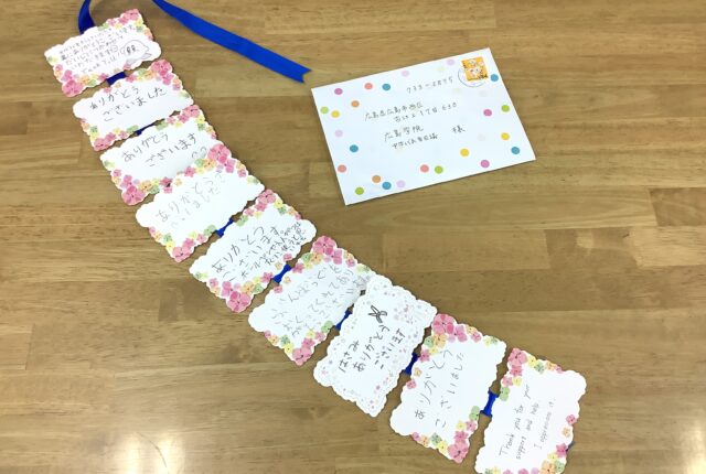 昨年度、中学代表者会議では文房具を集めて贈る活動を行っていました。先日、文房具を受け取った施設の方々からお礼のメッセージが届きました。 本校の生徒にボ…