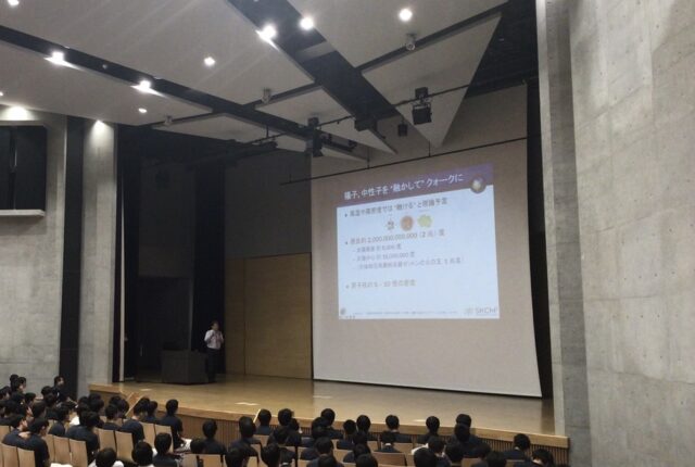 夏休みが明けて間もない9月5日に、広島大学クォーク物理学研究室の志垣教授と、構造有機化学研究室の院生の方に講演にお越しいただきました。 講演の前半では…