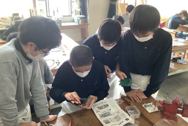 こちらは中2技術の授業。みんなで何かをつくってますよ。 集中してハンダ付けをしています。 なかなか細かい作業のようですね。 ニッパーを持って集中! け…