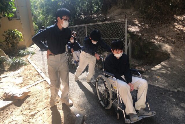 中2のILでは車いす体験をしました。車いすを押すことで操作を知り、乗ることで乗る感覚を体験することが目的です。 操作方法を学び、実際に体験です。段差を…