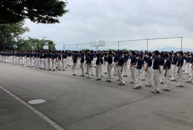 月曜日恒例の全校朝礼。皆、きちんと校長先生の話を聞いていました。でも、いつもとちょっと様子が…。 なんと、中学は1年生から解散です。いつもは3年生から…