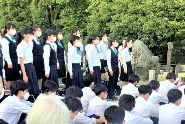 昨日は高2IL「命どぅ宝」ゼミの生徒たちにとって大切な日…放課後、比治山にある陸軍墓地に集まりました。 船舶砲兵部隊慰霊碑前に『対馬丸疎開学童』を悼む…
