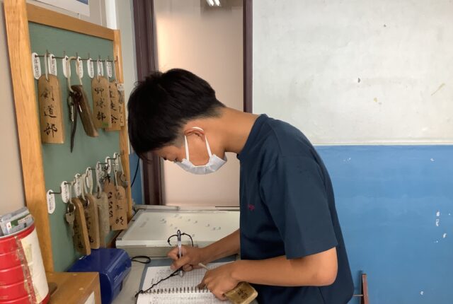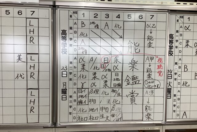 本日の時間割ホワイトボードです。高校生の授業は全て午前中にまとめられ、午後は「能楽鑑賞」です。高2や高3の授業は文系、理系、それぞれに選択科目もあった…