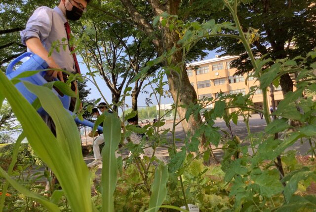 毎日朝早くから、水やりをする教員がいます。 国語科の小林先生です。花だけでなく、トマトやナスなどの野菜も植えています。 「大きくなれよ~」あたたかい言…