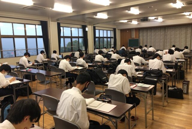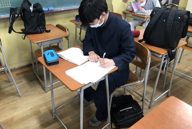 中間試験2日目の朝です。中学一年生の教室をのぞいてみると… 一足はやく登校して、自習する諸君がいますね。 初めての定期試験に、みんな緊張しています。 …