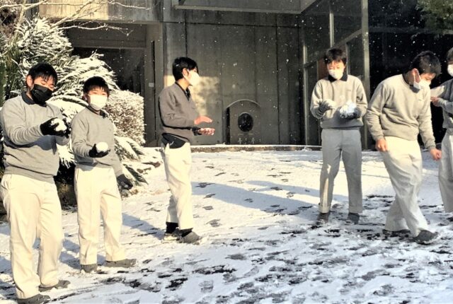 生徒が来る前の… 上グラウンド そして下グラウンド ザビエル体育館前 豪快な雪合戦はできないようですが、久しぶりに雪の感触を楽しんでいるようです… あ…