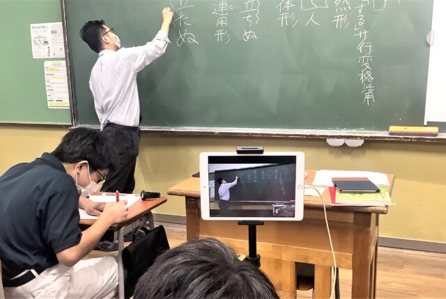2時間目…中1D組 国語の授業 一学期と同じように見えましたが… 欠席の生徒も家で受けられるように中継されていました。 カメラのすぐ後ろの生徒は自分の…