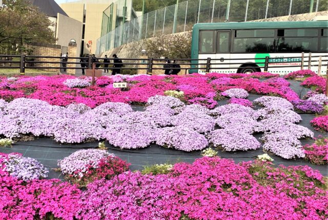 東門前には美しい芝桜のじゅうたん… 町内会の方々のおかげで、生徒たちの登下校も心が豊かになります。 私たちも学校周辺の美化に心を配らなければなりません…