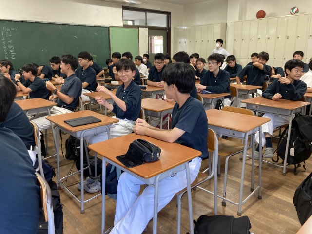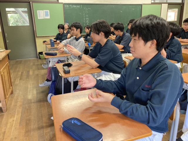 当日は、手話だけでは生徒たちは内容がわからないので、広島県ろうあ連盟から手話通訳の上田さんに来ていただき、手話を目で見て、通訳を耳で聞いてお話を聞きました。