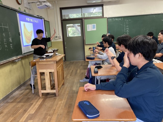 バナナやみかんをどうやって手話で表すか考えたり、先生が表した手話を当てるクイズ、