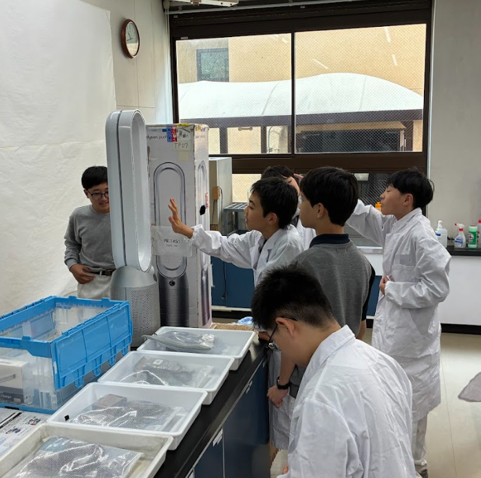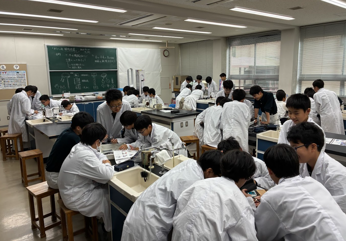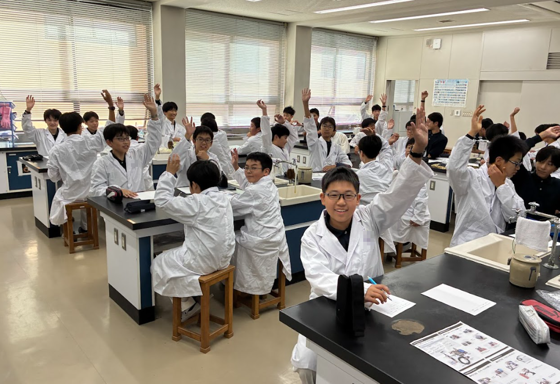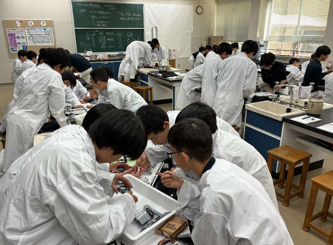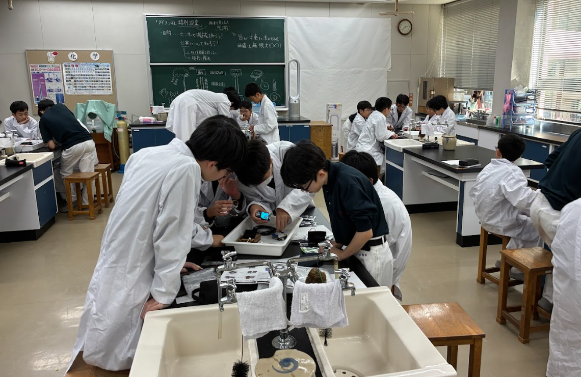 先学期には、東レの教材提供に申し込み、東レの中空糸フィルターをお借りして『水の浄化』に関する実験をしましたが、今回は、ジェームズダイソン財団提供の探求教材をお借りして、中1生達の化学実験をしました。(東レの中空糸フィルターの実験の記事はこちら:https://www.hiroshimagakuin.ed.jp/tayori/tayori-69044/)