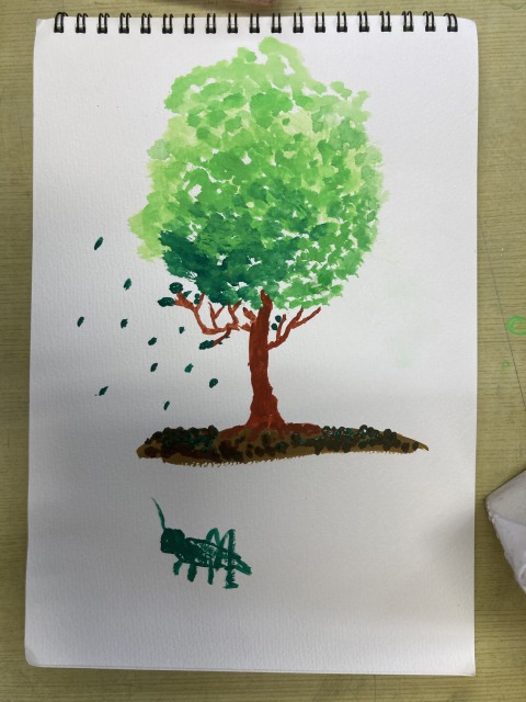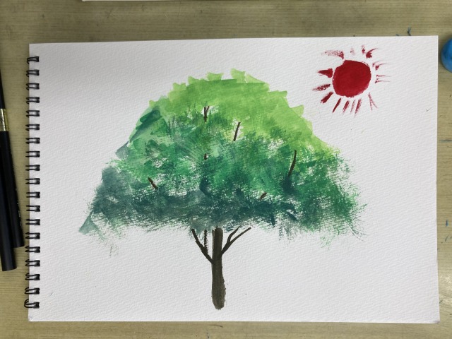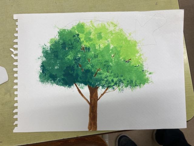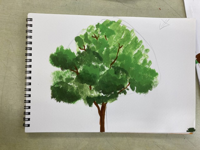 クラスで最も「素晴らしい木」を描けるのは誰か!?ということで、絵具の準備なども含め20分間で描いてもらいました。