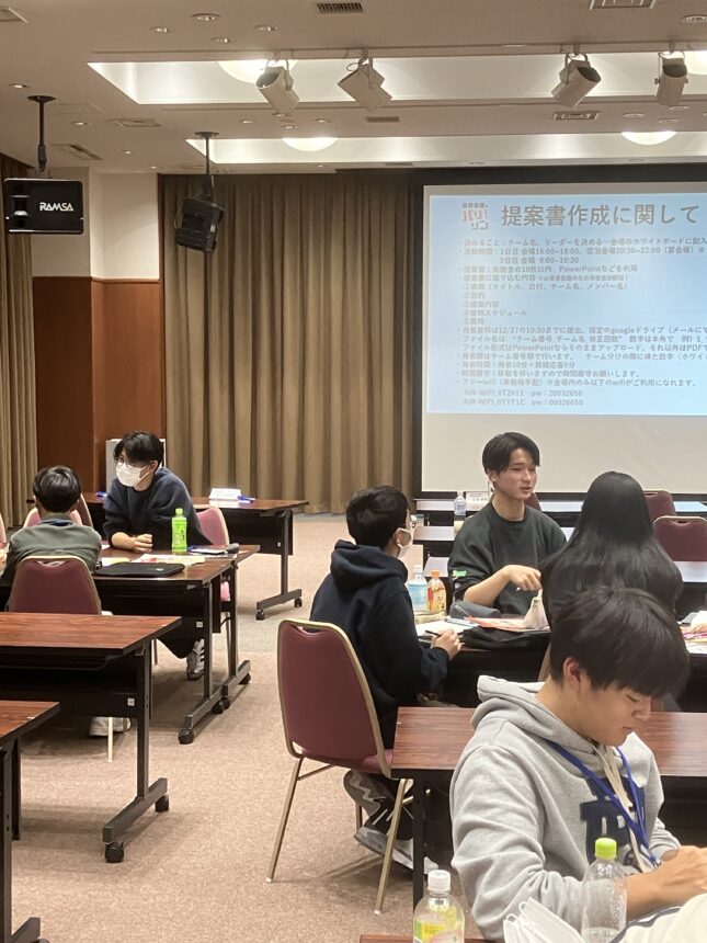 「市役所や地元企業の代表の方の話を聞き、グループで話し合って1泊2日で「若者・生産人口の定着」を図れる地域創生のビジネスプラン」をつくるというものでした。グループは当日安芸高田に集まった学校さん組んだのでごちゃまぜです。