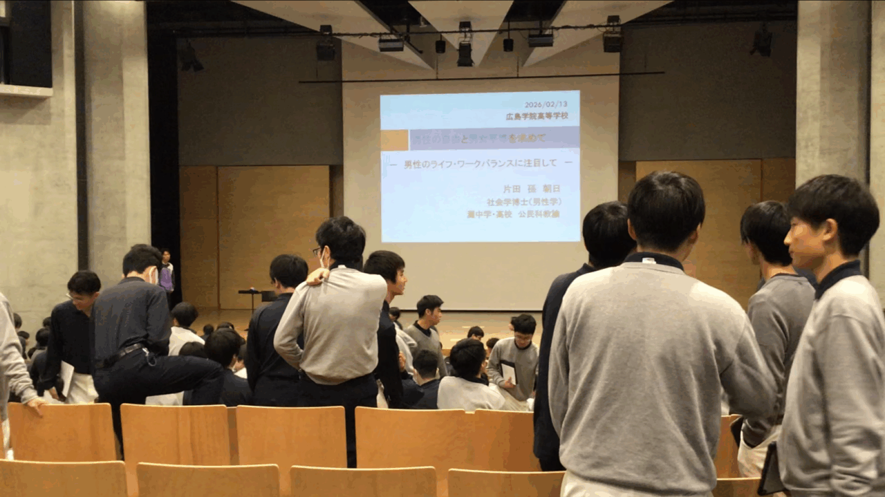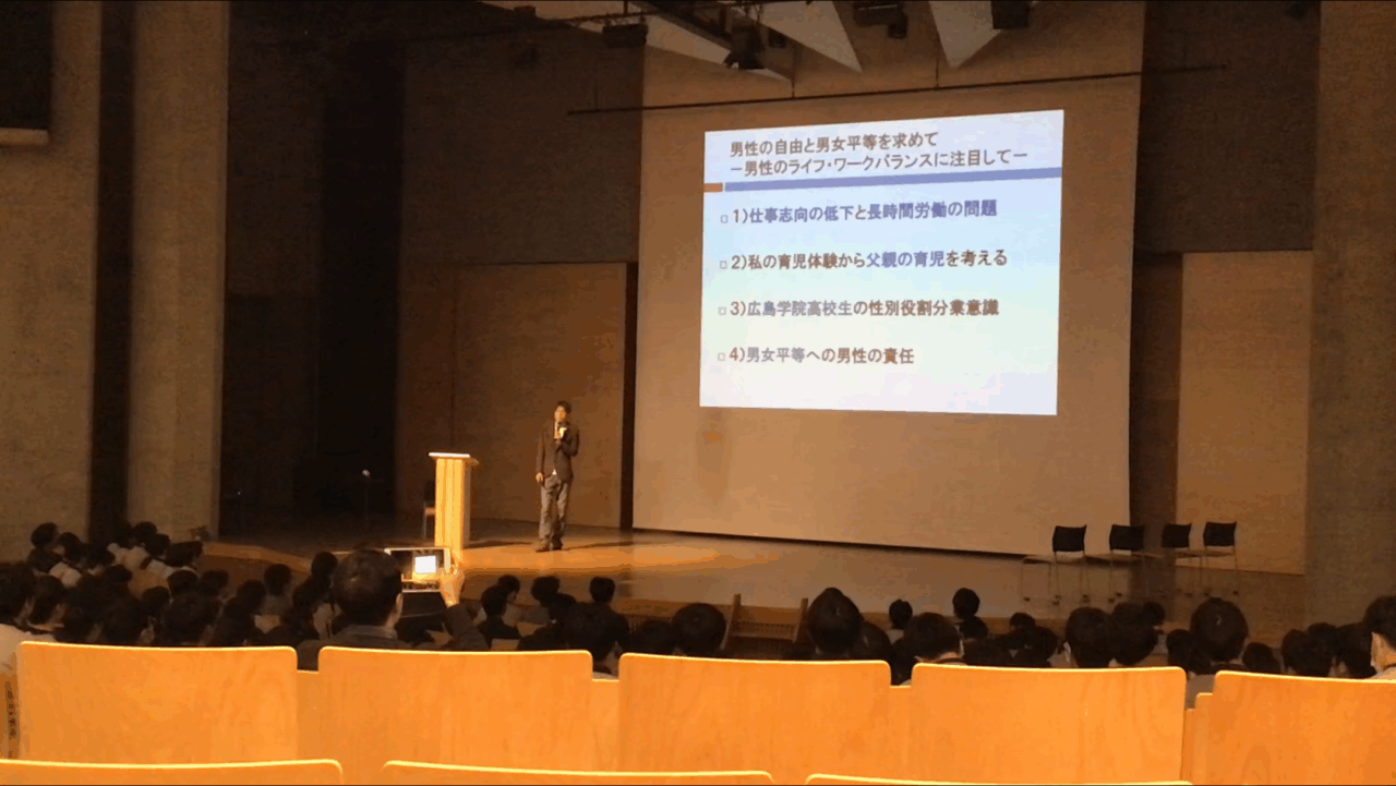 『男性の自由と男女平等を求めてー男性のライフ・ワークバランスに注目して』という演題で、灘中学校・高等学校教諭の片田 孫 朝日先生に講演していただきました。