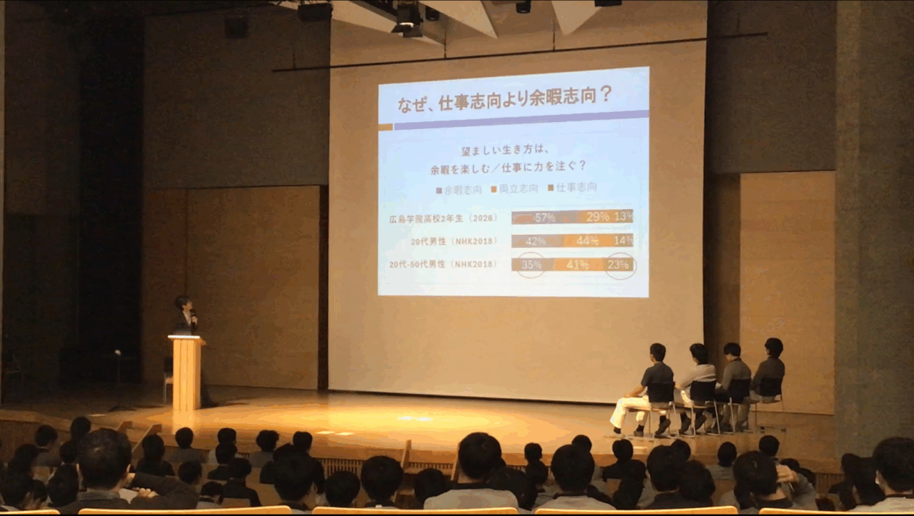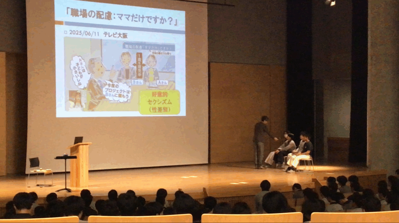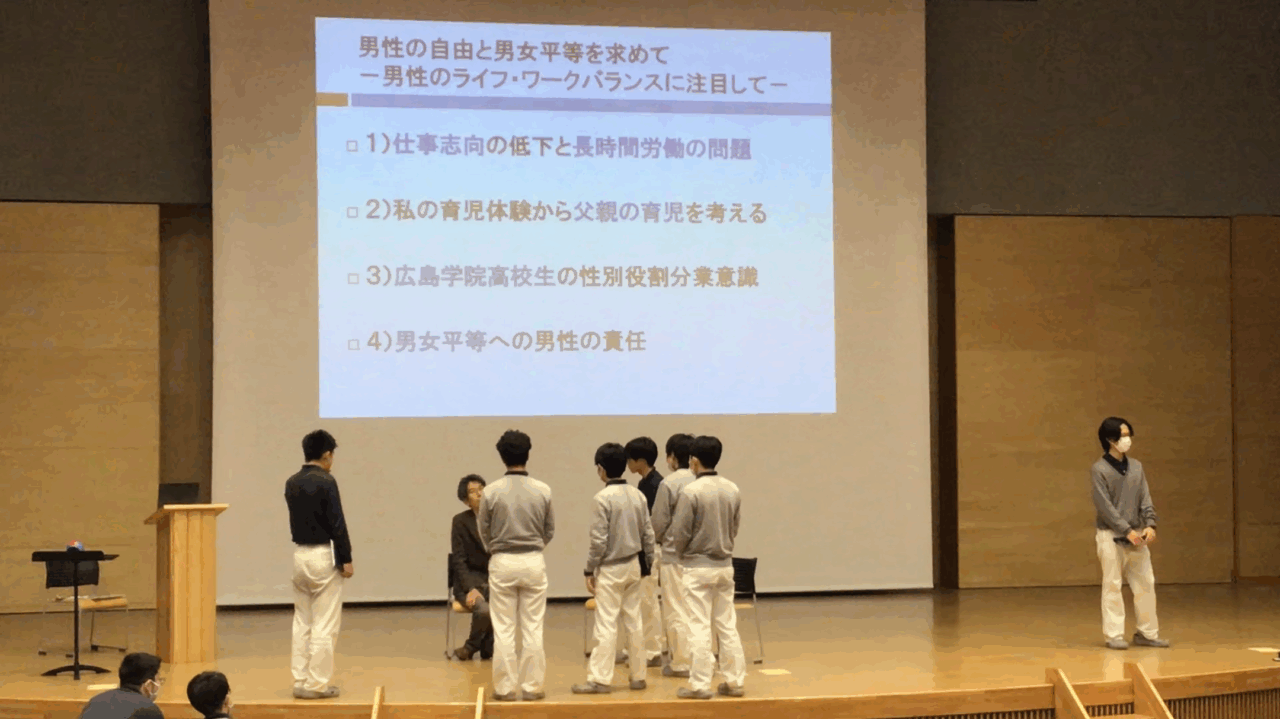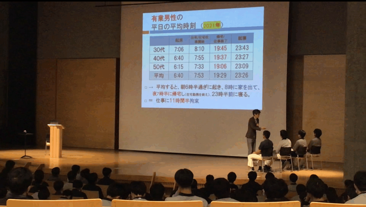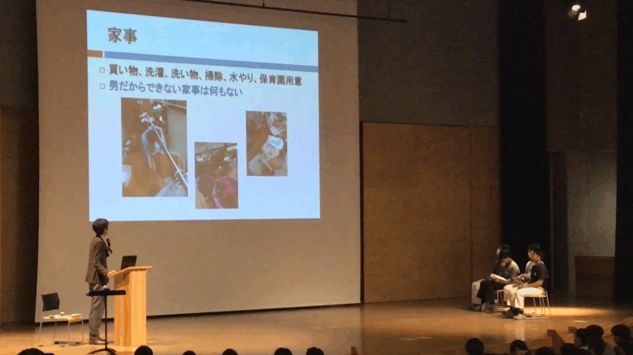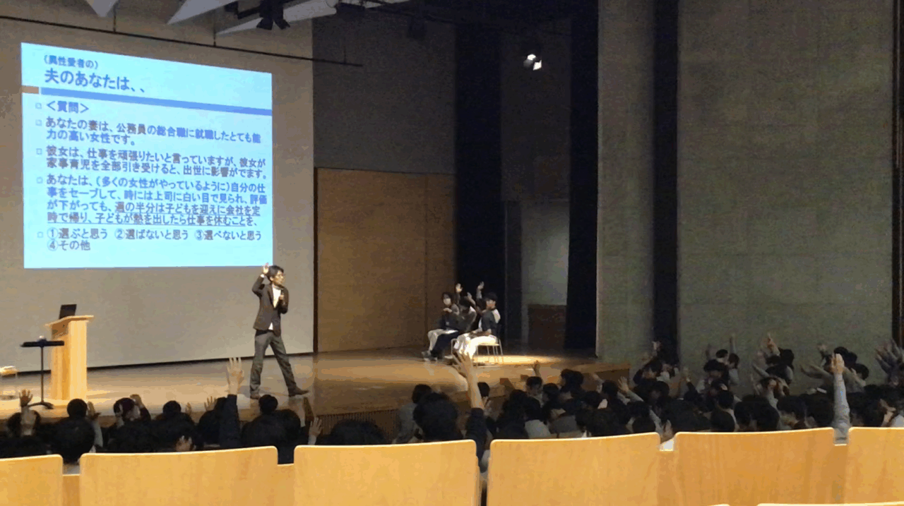 講演では実際に生徒たちが回答していたアンケートも使いながら、ワーク・ライフバランス、男女の仕事と育児の両立、育児における男の役割について話をしていただきました。