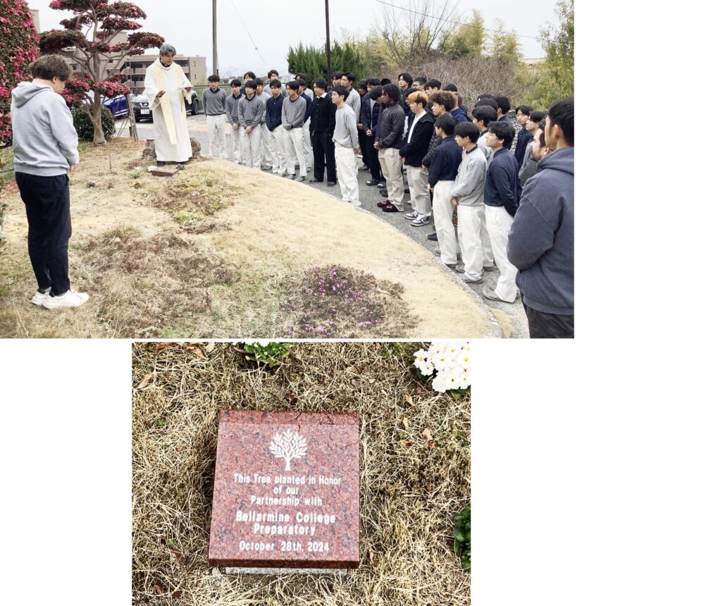2024年11月に来校された際に両校の「友情の証」として植樹されたアーモンドの木の前にて、記念碑除幕式が行われ越智神父より祝福がなされました。